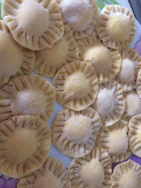 Stendere la pasta, ricavare dei dischi, farcirne uno con il ripieno e accoppiarli, chiudendo a mo' di raviolo e sigillando bene i bordi con l'aiuto di una forchetta.