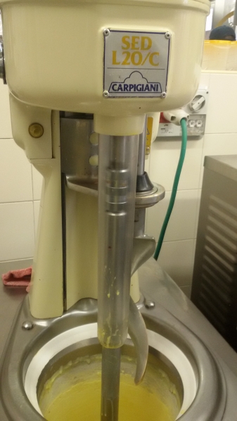 Una volta “maturato”, si mette nelle macchine mantecatrici, insieme alla pasta di nocciole, di pistacchi o di gianduia.