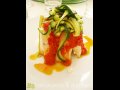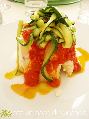 Si comincia con degli antipasti: involtini di melanzana, tortino di ricotta e salsiccia su letto di salsa agli asparagi, tortino di farro avvolto nel lardo di Colonnata, e poi una variazione di 4 antipasti: baccalà mantecato in extravergine, ampolla natatoria avvolta in pancetta, spaghetto fritto di baccalà, mozzarella e baccalà in pastasfoglia