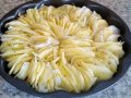 Sbucciare, lavare e tagliare patate e cipolla con l'aiuto della mandolina. Sistemarle, poi, in una teglia, alternando 3-4 fette di patate con una di cipolla, formando prima il cerchio esterno e dopo quello interno.