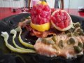 In una teglia rivestita con carta forno, mettere il salmone con i capperi e la scorza di limone.