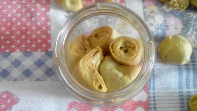 In seguito vengono scolati e disposti (distanziati l’uno dall’altro) su una tovaglia di cotone. Una volta raffreddati vengono inseriti con delicatezza nei barattoli di vetro, facendo attenzione a non schiacciarli e a non lasciare troppi spazi vuoti. Si riempiono con olio d’oliva e li si lasciano riposare per almeno una nottata. Se il livello dell'olio scende, se ne aggiunge dell'altro fino a coprire i carciofini.