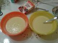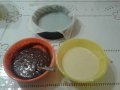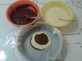 Versare nel centro della teglia 3 cucchiai di impasto chiaro e al centro di essi 3 cucchiai di impasto scuro e procedere in tal modo fino all’esaurirsi dei due composti.