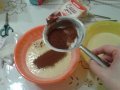 Dividere l’impasto a metà: lasciare una metà ‘gialla’ e all’altra aggiungere, sempre setacciandolo, il cacao e ottenere quindi un impasto ‘scuro’.