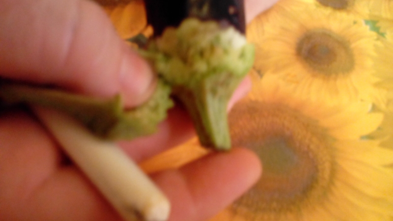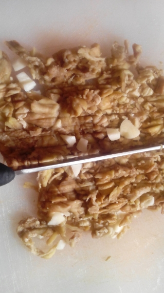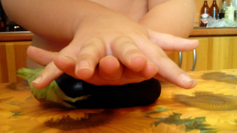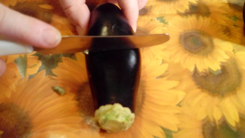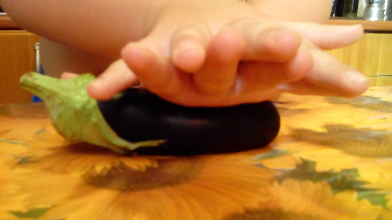 Prima di ogni cosa mia mamma lavorava le melanzane in questo modo: con entrambe le mani poggiate una sull’altra e sulla melanzana la pressava e la faceva roteare come un rotolino. Questa tecnica serve per agevolare il distacco dell’interno della melanzana dalla buccia.