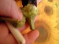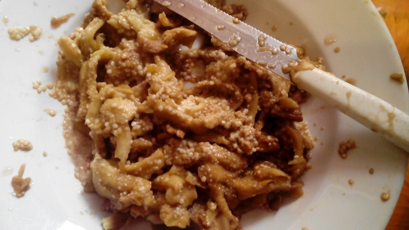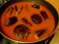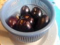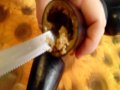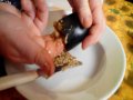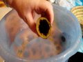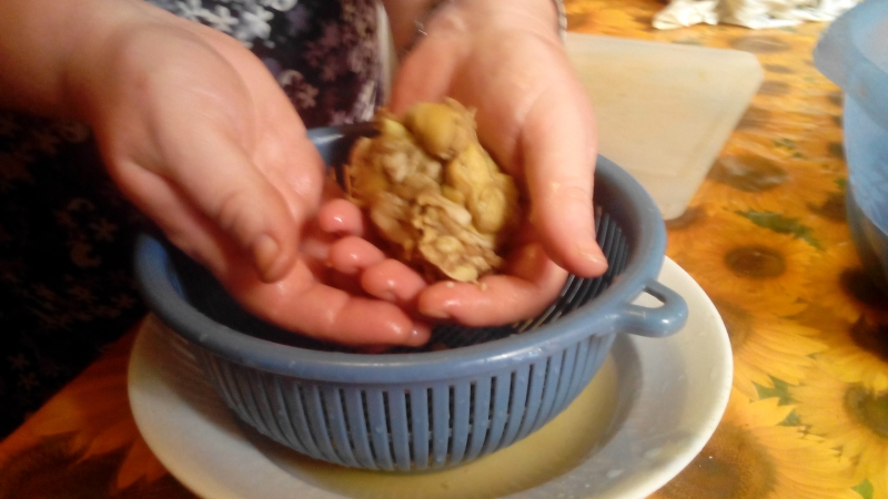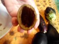 Si taglia la parte dura attaccata alle foglie e con l’aiuto di un coltello, si incide sulla parte superiore, si estrae la parte interna e la si mette in un piatto. L’involucro della melanzana (divenuto così un “cesto contenitore”) si pone all’interno di una grossa coppa con dell’acqua. Una volta finita la procedura con tutte le melanzane, si immergono gli interni delle melanzane nell’acqua per far scendere i semi. Si ripete questa operazione più volte (anche sotto il rubinetto e stritolando con le mani) finché l’acqua diventa limpida e si sono tolti tutti i semi.
