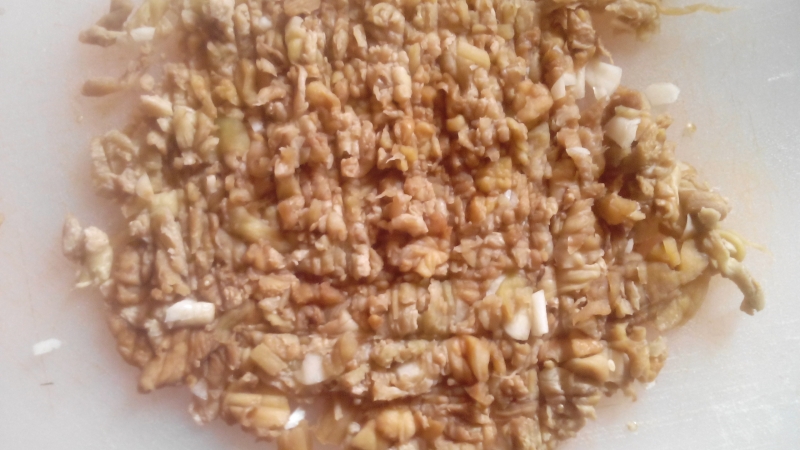 Si strizzano, si tritano finemente insieme allo spicchio d’aglio e al prezzemolo, si pongono in una coppa con mollica di pane, formaggio grattugiato e macinato. Una volta amalgamati questi ingredienti si aggiungono le uova. Il ripieno deve risultare al tatto morbido e appiccicoso.