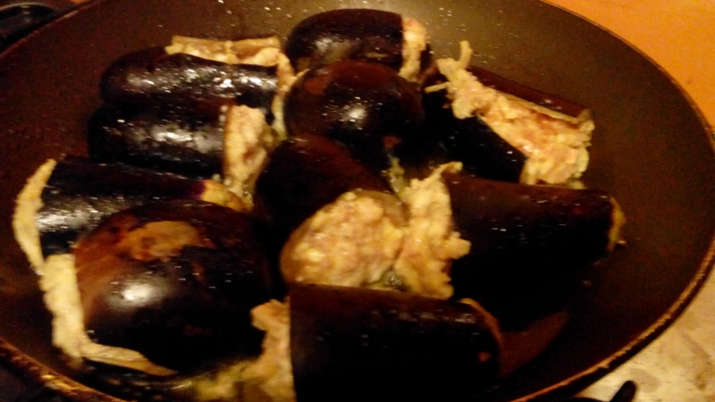 Lavare due tre volte anche le melanzane e riempirli con il composto preparato precedentemente. In una padella, soffriggere queste melanzane ripiene avendo cura di girarle solo quando si vede un accenno di doratura alla base; la buccia deve risultare raggrinzita e leggermente indorata.
