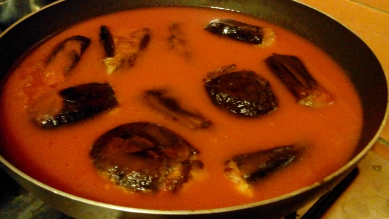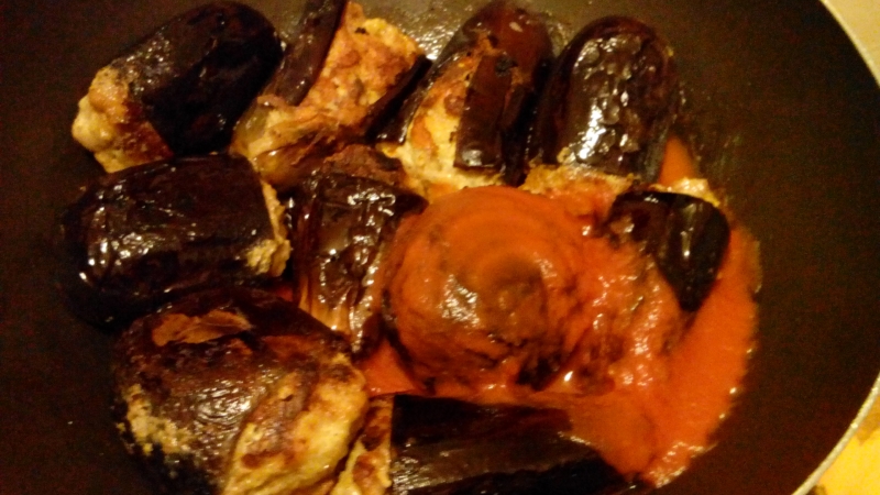 Trasferire le melanzane in un tegame a bordi alti alla cui base è stato posto un filo d’olio e aggiungervi la salsa di pomodori o i pomodori freschi, il peperone, un mezzo cucchiano di sale grosso e un mezzo bicchiere d’acqua. Mettere il coperchio, cucinare a fuoco vivo finché non bolle e poi abbassare la fiamma e continuare la cottura per almeno una trentina di minuti (la forchetta deve entrare agevolmente nella buccia della melanzana). Ogni tanto girarle con molta delicatezza.