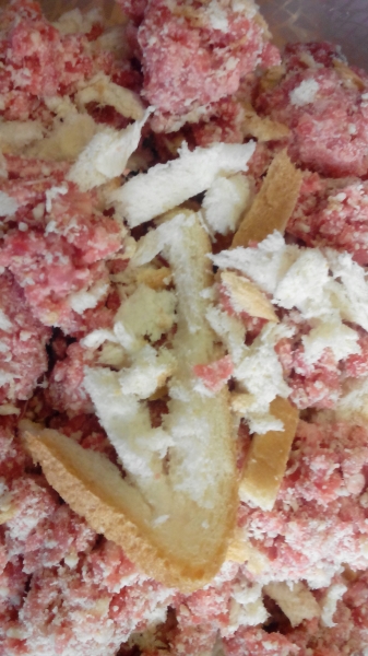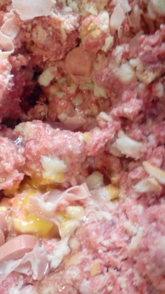 Sbriciolare il pane, aggiungere il macinato, il sale, l’olio. Amalgamare, aggiungere la mortadella, e impastare, poi aggiungere il formaggio e impastare di nuovo. Aggiungere le uova e amalgamare. Tagliare un foglio di carta da forno (dimensione cm 40x40), ungerla con un po’ di olio d’oliva, metterci l’impasto e dargli la forma di un salsicciotto servendosi anche della carta.