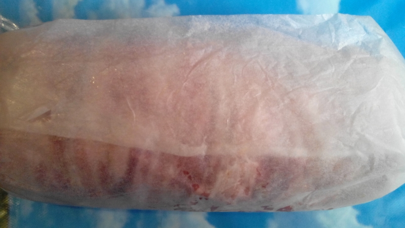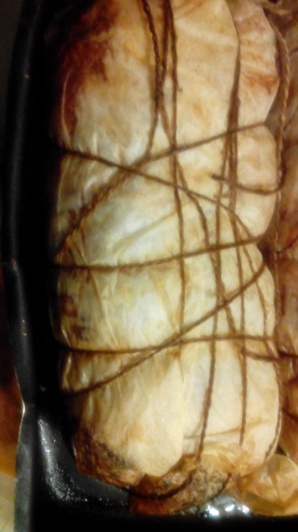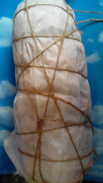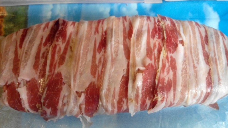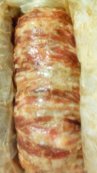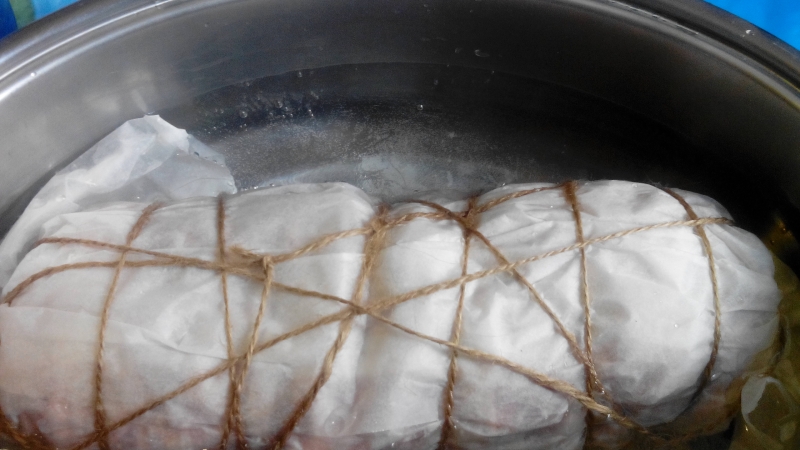 Rivestire con la pancetta tutto il salsicciotto. Avvolgerlo con la carta da forno oleata e legare con un filo di spago per alimenti. Metterlo in una teglia e ricoprirlo con acqua per metà polpettone, mettere il coperchio e lasciar bollire per una mezzoretta.