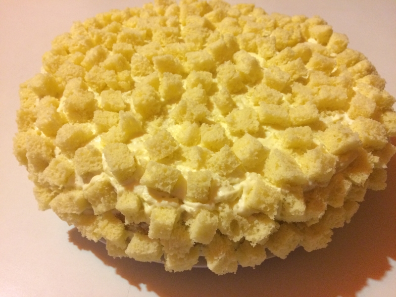 Usare la restante crema per ricoprire la torta e completare con i cubetti di Pan di Spagna.