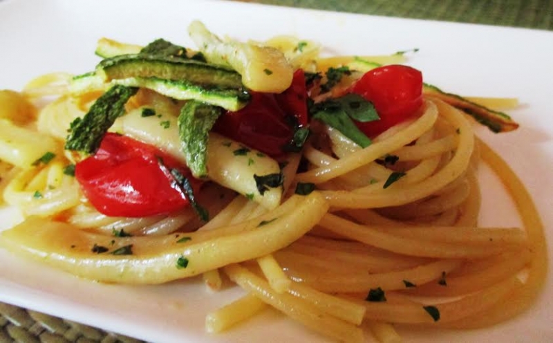 Spaghetti con totani al pesto aromatico e zucchine croccanti
