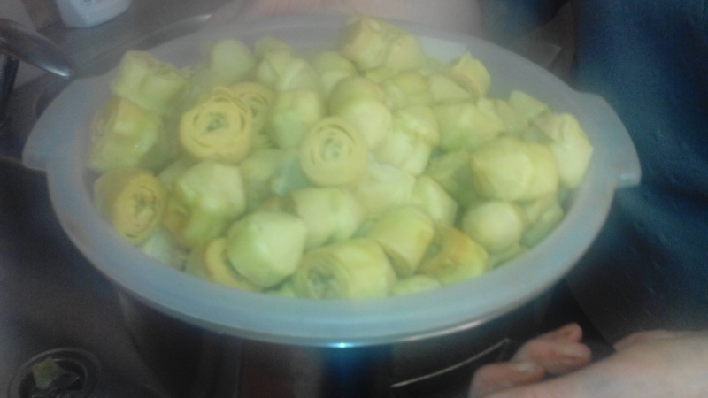 Quando tutti i carciofini sono puliti, li si prendono con le mani (insieme anche a qualche mezzo limone del lavaggio e in modo che non siano completamente scolati) e si trasferiscono in una grossa pentola. Si ricoprono con aceto e vino, si aggiunge del sale grosso e si mettono a cucinare. Il tempo di bollitura non può essere standard: dipende dalla varietà del carciofo, dalla terra di provenienza e dalla freschezza del prodotto. La cottura si conclude quando al tatto (o con l’aiuto di una forchetta) il carciofino risulta al dente. In generale dopo 5/10 minuti dopo la bollitura.