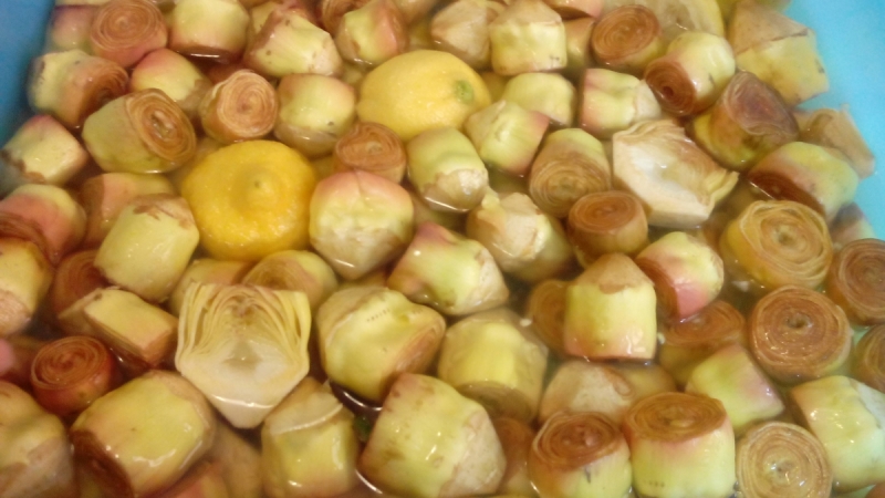 I carciofini vanno sfogliati fino a quando l’aspetto diventa molto chiaro e/o si sente tra le mani quel tipico spezzarsi di 'ciò che è tenero'. Appena mondati, vanno immersi in abbondante acqua con qualche limone spremuto.
