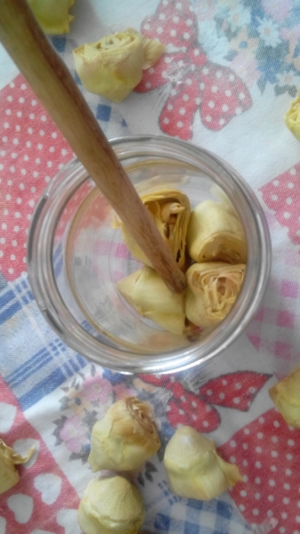 In seguito vengono scolati e disposti (distanziati l’uno dall’altro) su una tovaglia di cotone. Una volta raffreddati vengono inseriti con delicatezza nei barattoli di vetro, facendo attenzione a non schiacciarli e a non lasciare troppi spazi vuoti. Si riempiono con olio d’oliva e li si lasciano riposare per almeno una nottata. Se il livello dell'olio scende, se ne aggiunge dell'altro fino a coprire i carciofini.