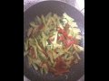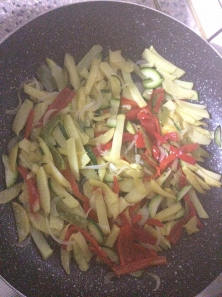 In una padella antiaderente, far imbiondire la cipolla, tritata finemente, nell'olio. Aggiungere patate, zucchine e peperoni lavati, puliti e tagliati a striscioline e far cuocere il tutto a fuoco vivace.